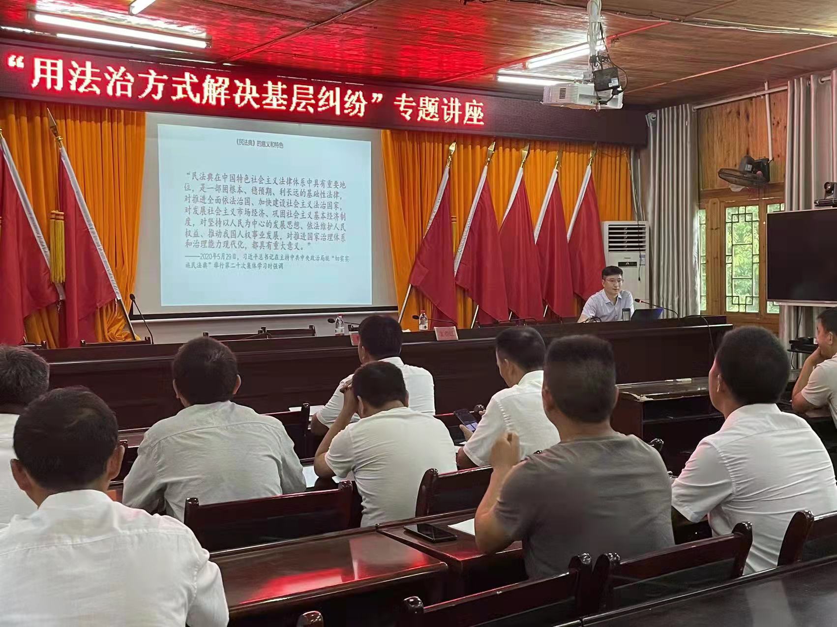 在施洞镇政府,MK网页版乡村振兴团队的覃远春教授结合事前收集的普遍性的基层纠纷案例,以通俗易懂的语言,围绕民间借贷、担保、离婚冷静期、邻里纠纷等方面给镇干部和施洞镇所辖各村的调解员上了一堂“用法治方法解决基层纠纷”的专题讲座,讲座后覃远春与参会培训人员还进行了沟通和交流,耐心细致地解答了参会培训人员咨询的法律问题。