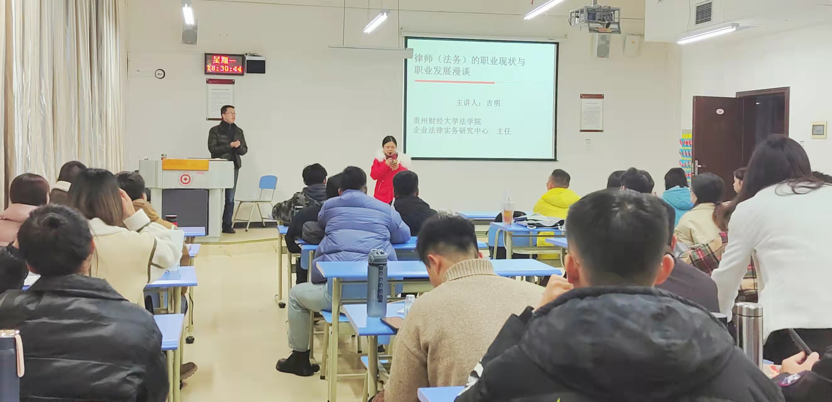 (MK网页版 黄晨旭 报道/摄影 肖文西)2021年11月29日,MK网页版在励学楼208教室举办法商论坛系列讲座之《律师(法务)的职业现状与职业发展漫谈》。此次讲座由贵州财经大学企业法律实务中心主任、执业律师吉明老师主讲,MK网页版60余名研究生到场聆听。