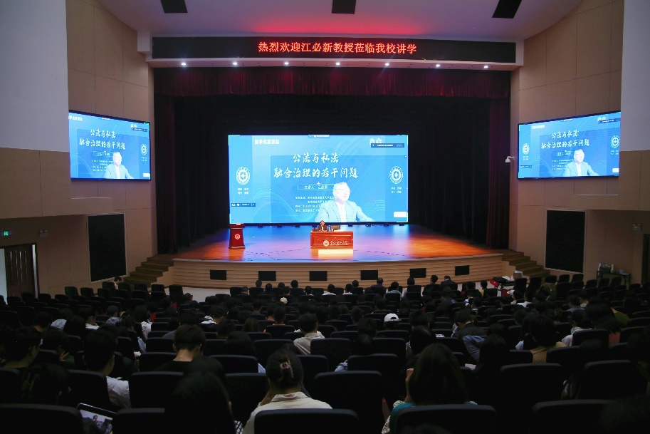 讲座中,江必新对公法私法的划分标准进行了具体阐述,进一步剖析了不同类型划分标准的利弊,并围绕《民法典》中公私法规范数量、公法的私法化及私法的公法化趋势、实务中公私法融合情形等三个方面,展开对公私法融合治理的若干问题的探讨。随后针对特定关系的公私法适用、不同机构对公私法纠纷处理情形、公法行为与私法行为合法有效的标准问题、如何判定公法行为对私法行为的效力、公权力机关赔偿责任的性质等问题进行了重点论述。最后,江必新结合生动的案例,通过联系实际,以案释法、以法论事,让同学们对公法与私法融合治理过程中出现的问题有更深入的认识。