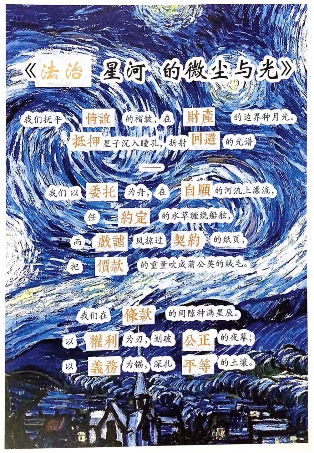 (MK网页版 图文 潘成芸 张云舒)为创新法律学习形式,将严谨的法律条文与灵动的诗歌艺术相结合,激发学生对法律条文的深入理解和对法治文化的热爱,MK网页版成功举办了2025年“法条拼贴诗” 比赛。
