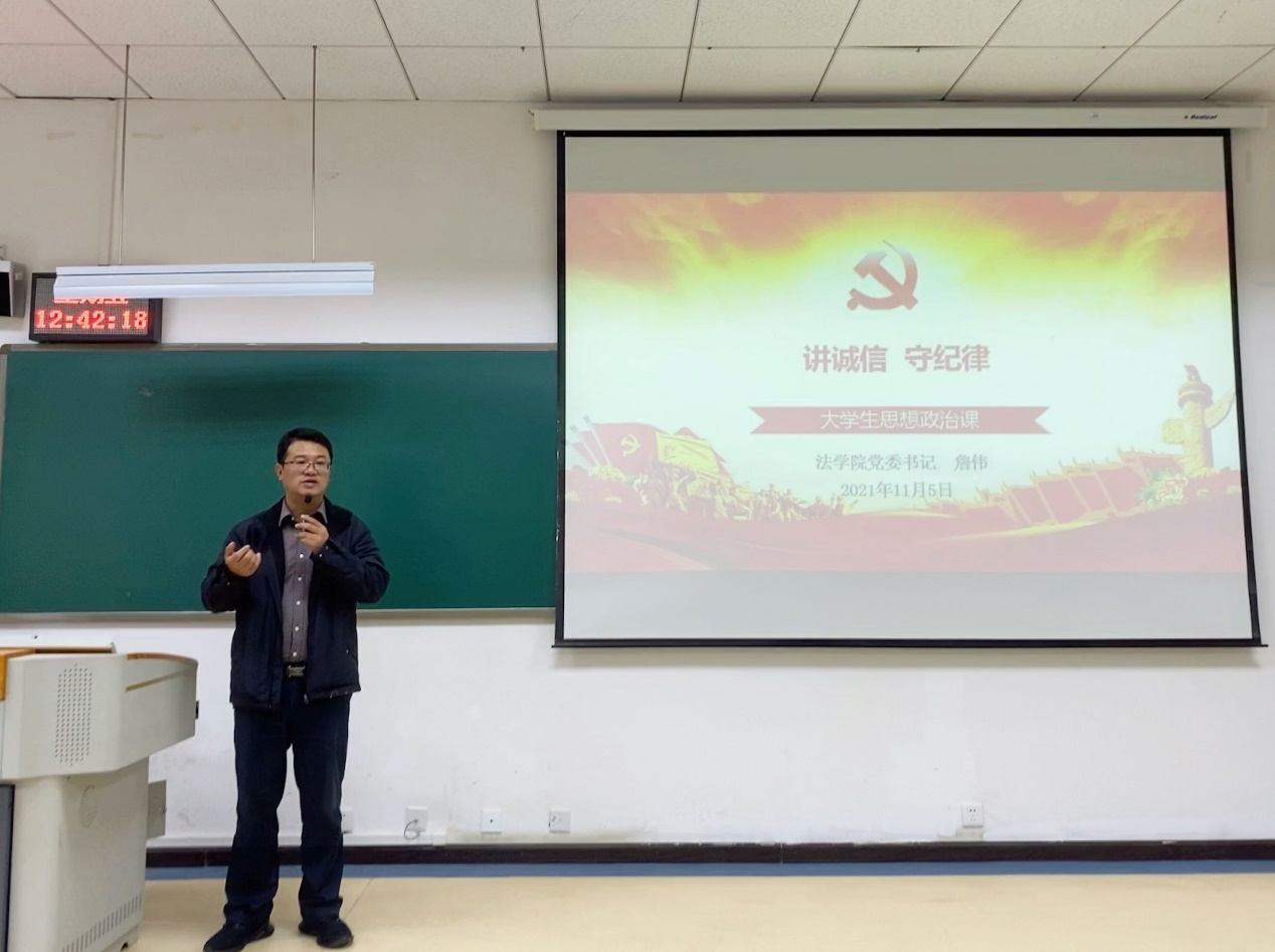 (MK网页版 图文/报道 杨洁芮)为增强同学们的诚信意识,提升同学们的诚信规范,2021年11月5日中午12:30,MK网页版党委书记詹伟在乐学楼1-1教室上题为“讲诚信,守纪律”的大学生思想政治课,学院在校本科生、研究生共120余人参加。校学生工作部(处)蔡利红老师到场听课。