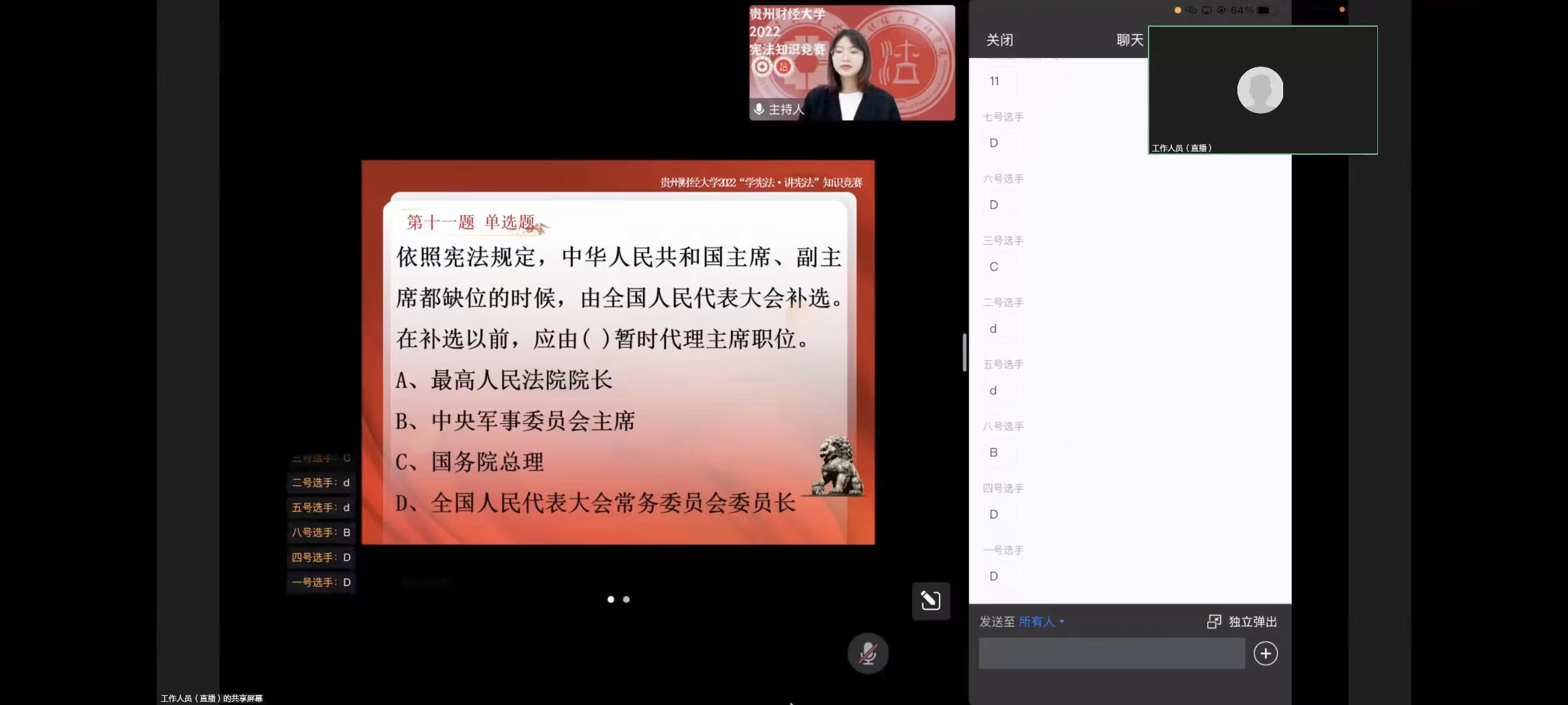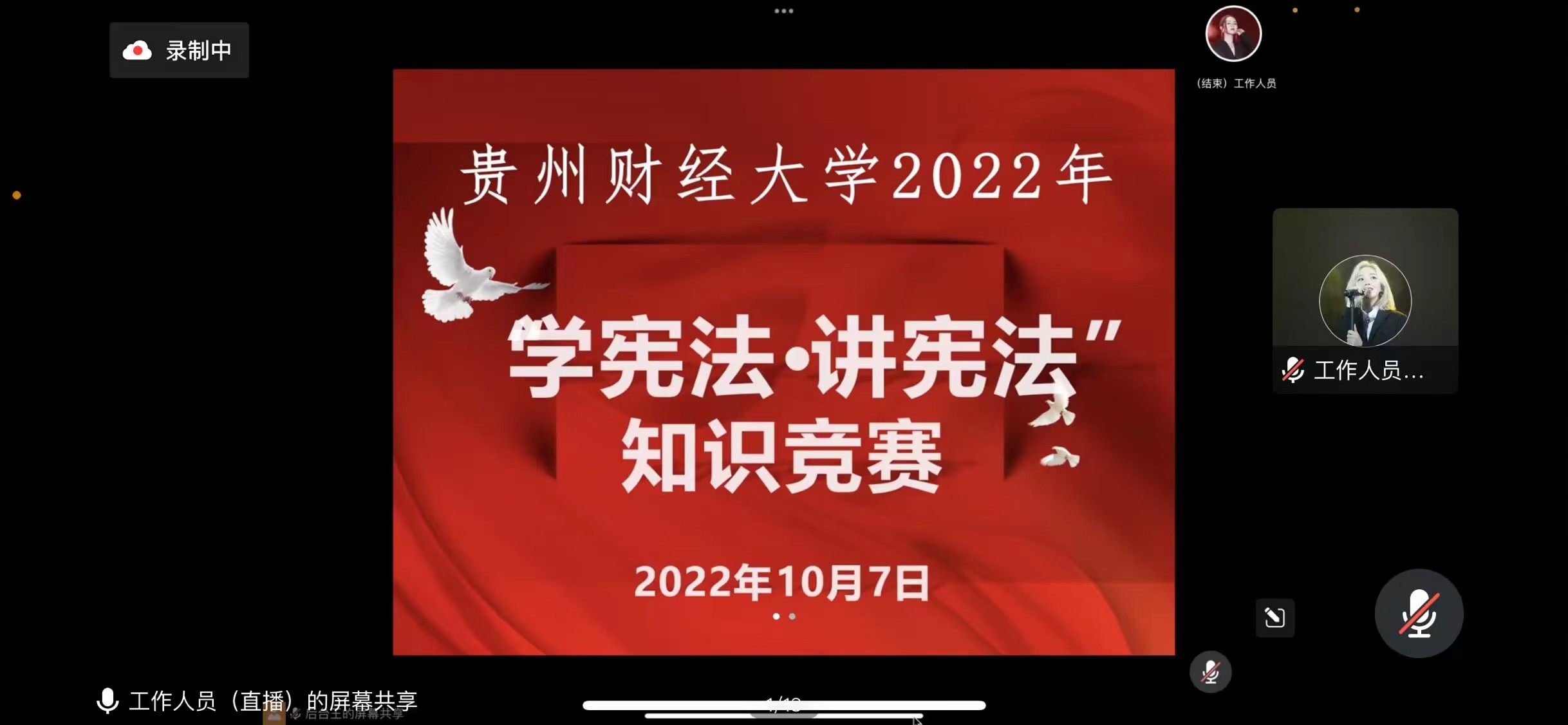(MK网页版)为深入学习贯彻习近平法治思想,纪念现行宪法颁布施行四十周年,更好地发挥宪法在全面依法治国和校园文化生活中的重大作用,我校于10月7日下午举行2022年“学宪法 讲宪法”线上知识竞赛。本次比赛由MK网页版承办,各学院共计八名选手参赛。全校近200余名师生线上观看了比赛,我院武汉大学法学博士谷骞担任评委。