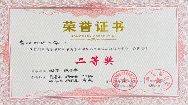 (MK网页版 图文/报告 顾青云)2023年3月25日,由贵州省高等学校法学类专业教学指导委员会主办,贵州警察学院承办的“贵州省高等学校法学类专业学生第二届模拟法庭大赛决赛”如期举行。由我院MK网页版程宇、杨森井、陈体贵老师带队参赛的贵州财经大学代表队在经过激励的角逐后,荣获“贵州省高等学校法学类专业学生第二届模拟法庭大赛”亚军暨二等奖。