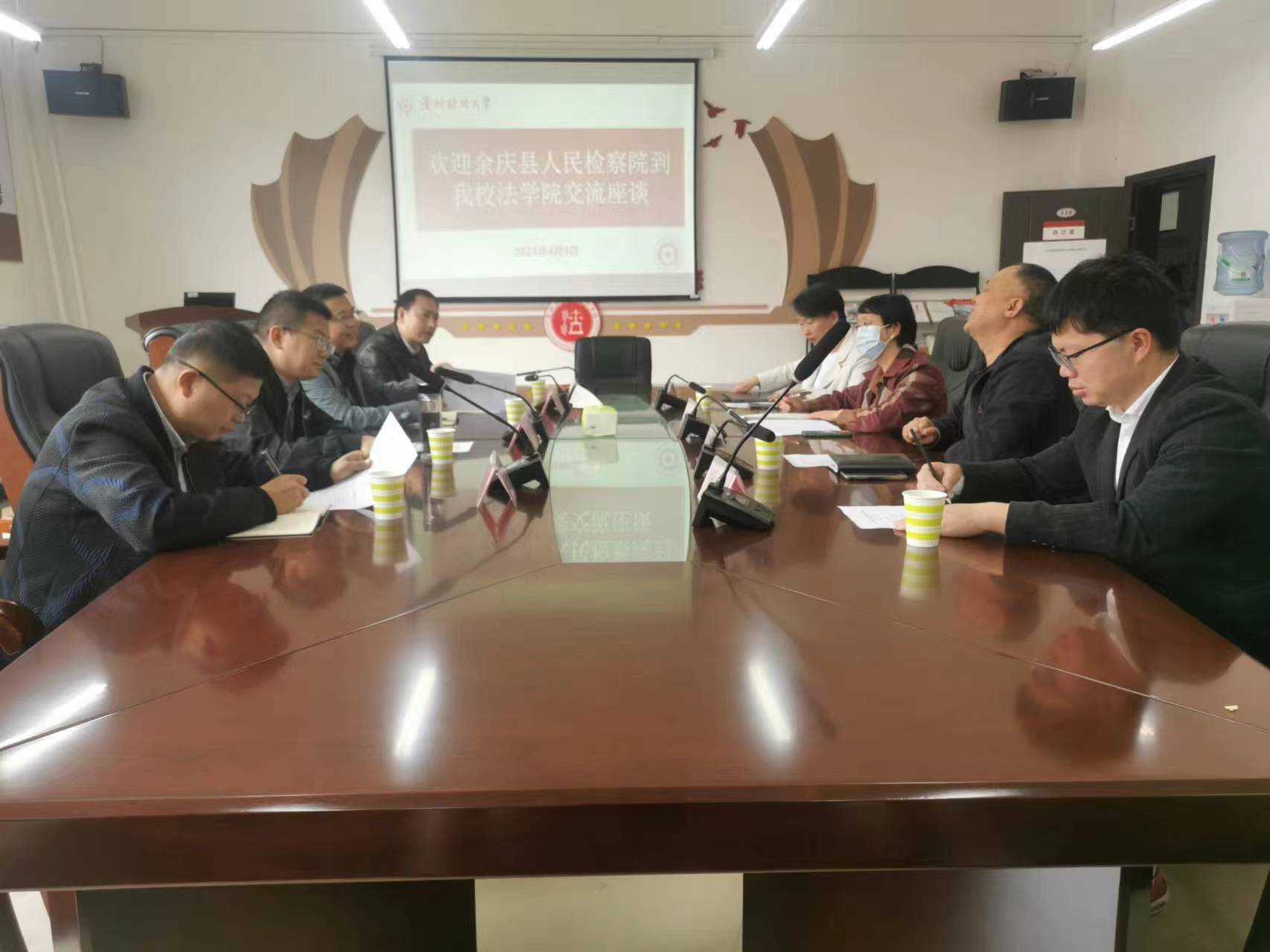 (MK网页版 任红 报道/摄影 刘彩霞)2024年4月9日下午,余庆县人民检察院党组书记、检察长卢国涛,党组成员、副检察长李涛,党组成员、政治部主任刘武松,第三检察部主任祝江到访我院,与MK网页版就检校共建事宜进行交流。MK网页版党委副书记、院长陈玉梅教授,MK网页版党委委员、副院长曹务坤教授及教师代表出席座谈会。会议由曹务坤主持。