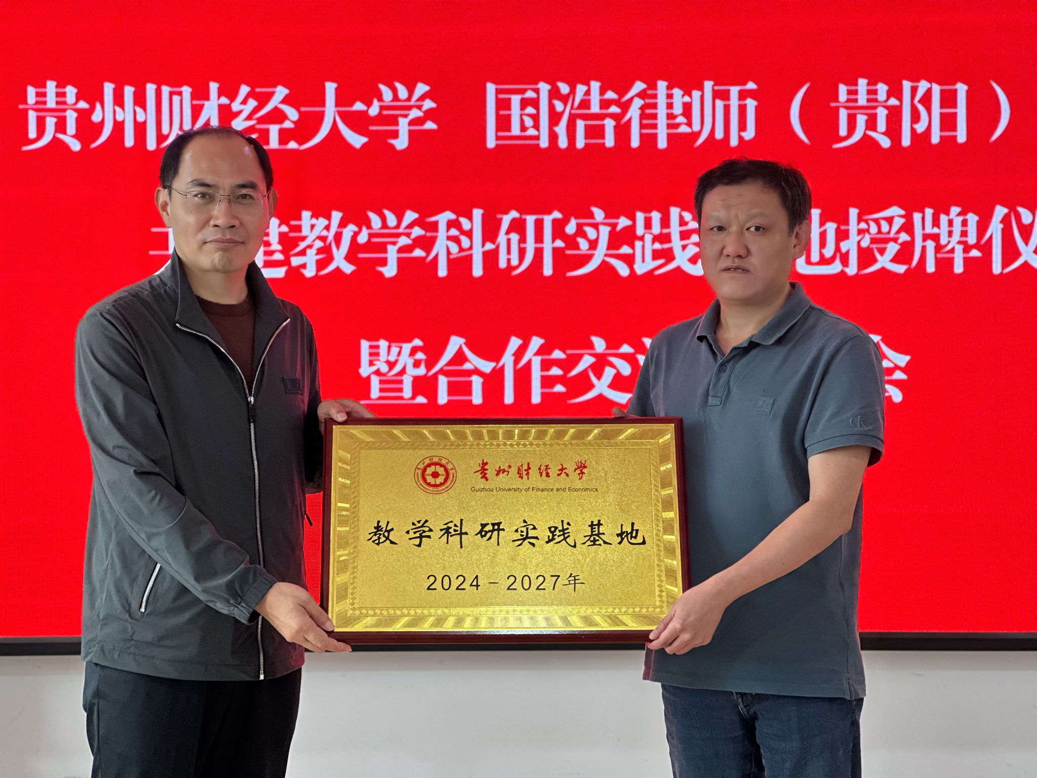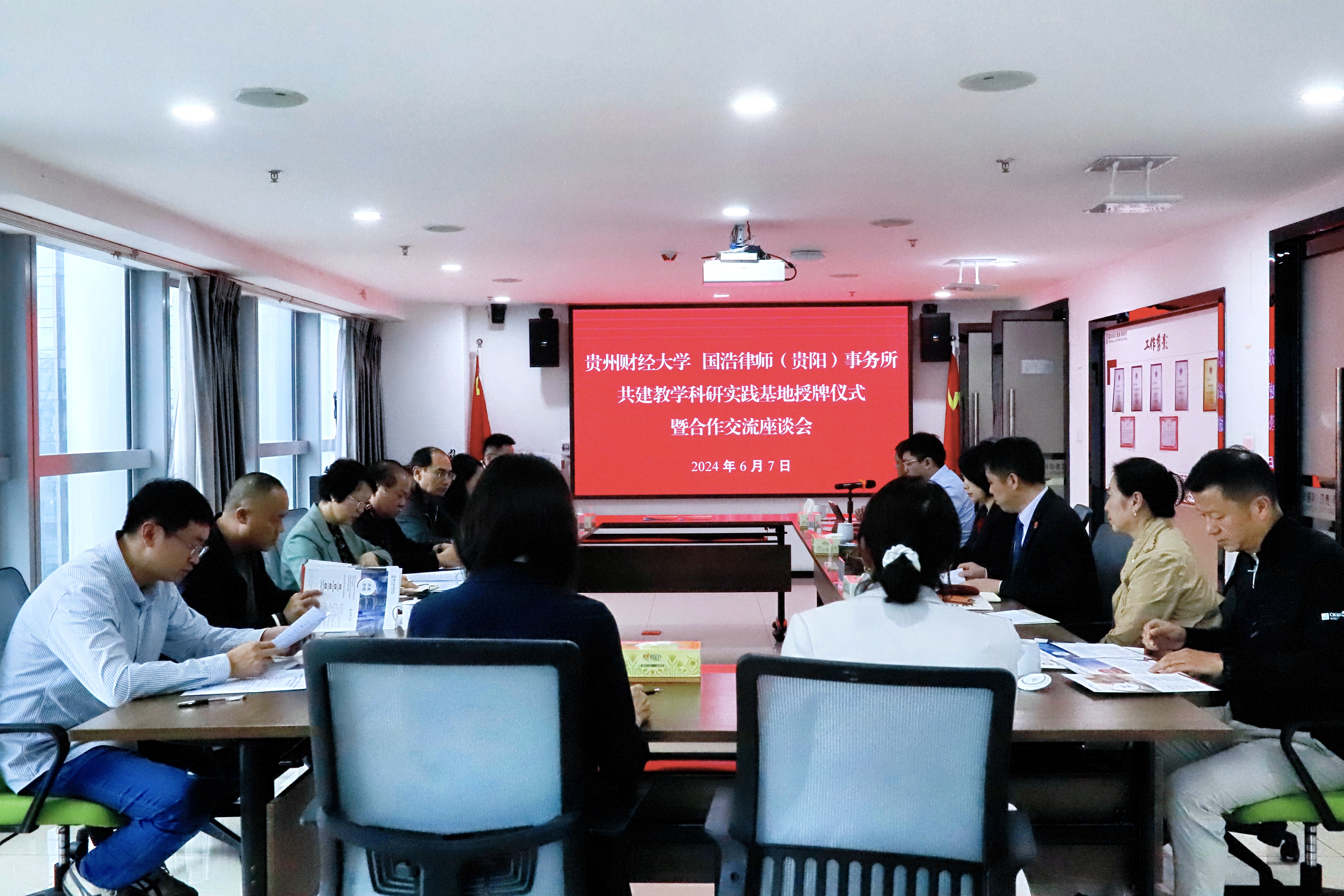 (MK网页版 王霖 图文/报道)2024年6月8日下午,贵州财经大学特聘教授、贵州省社会科学院原党委书记吴大华;MK网页版党委书记邵新顺,党委副书记、院长陈玉梅一行前往国浩律师(贵阳)事务所(以下简称为“国浩贵阳律所”),举行共建教学科研实践基地授牌仪式暨合作交流座谈会。贵州省律师协会会长、国浩贵阳律所合伙人白敏;国浩贵阳律所主任、管理合伙人郑世红,党支部书记、管理合伙人兰钢等人员出席会议。会议由国浩贵阳律所管理合伙人潘志成主持。双方就党建工作开展、法商融合型人才培养、科研合作创新、实践成果转换等问题进行了深入交流。