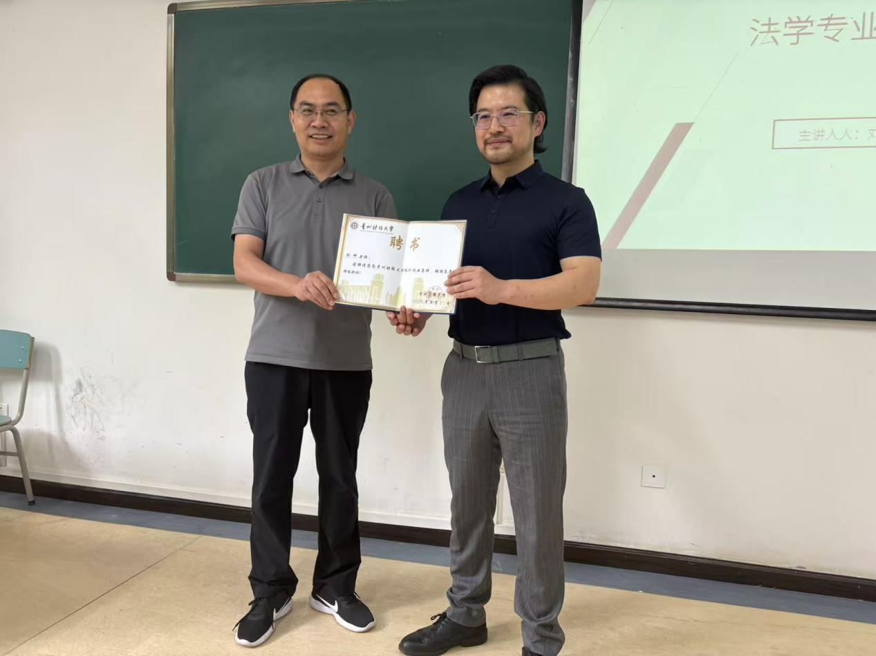 (MK网页版 胡小玲 张云舒 报道|摄影 )为助力学生明晰职业方向,增强职业规划能力,MK网页版于6月3日在文德楼103教室举办《法学专业就业和职业选择》专题讲座。本次讲座特邀贵州公成律师事务所主任刘坤授课,MK网页版党委书记邵新顺出席并为刘坤颁发贵州财经大学校外就业导师聘书,120余名师生参加本次讲座。